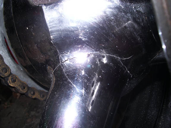 The pressure dropped more because the short ride I took yesterday morning caused the wheel to crack more. I swear this wheel is close to breaking. 2 of the 3 spokes are cracked, and the one in the photo is actually broken open. So I'm talking to Bill, one of the owners of Flatout Racing where I bought the bike in 2002 and he's explaining that he's seen a lot of cracked Busa wheels...from folks 'stuntin' and such. I do the occasional wheelie and rolling burnout...that's it. Fucker quoted me a price for a new chrome wheel at $900+...FOR ONE FUCKIN' PRONE TO CRACKING SUZUKI WHEEL!!