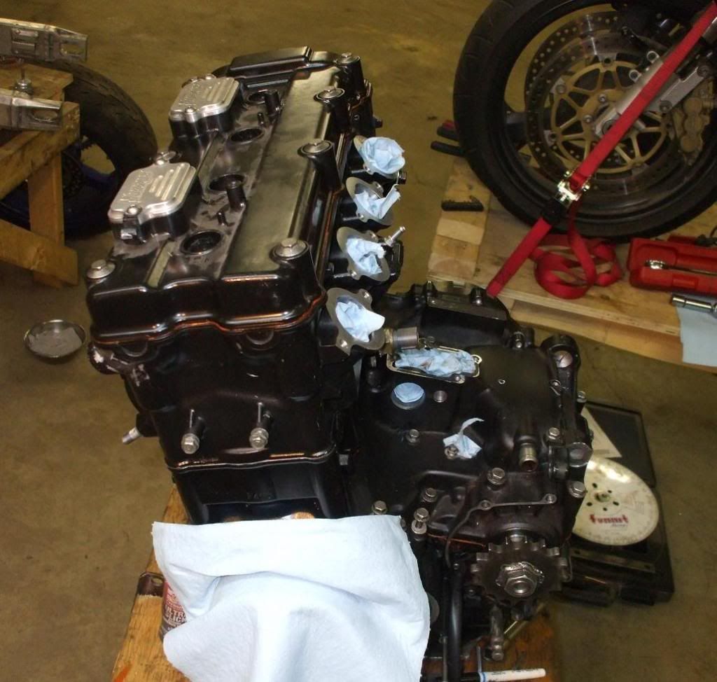 motor is ready to go back in the bike minus the oil pan slosh plate i havent made yet(going to copy the oil pan baffle for a gsxr 1000 on the Schnitz poster on my wall). family dinner is going to hold up progress today. thinking about pulling an all nighter