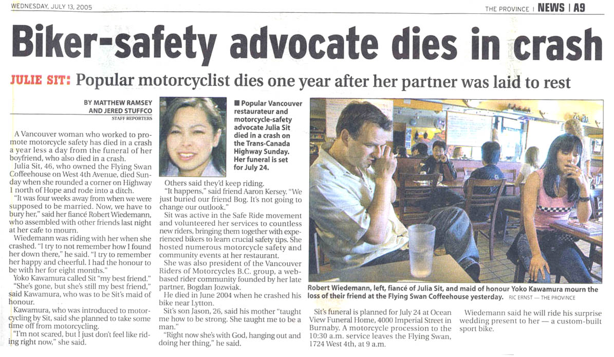 Julia Sit, owner of the Flying Swan Motorcycle Cafe in Vancouver, BC, passed away in a tragic accident on route back from "Bog's Loop" towards Hope, BC, Sunday evening, July 10th, 2005. Julia failed to negotiate a gentle right hand corner, ran off the road, and succumbed to her injuries. Witnesses said that Julia was not speeding, and it appeared as though she simply veered off the road. Julia is survived by her son Jason, her parents, two brothers and her fiance Robert.