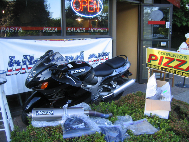 The draw was held at Sorrento's Pizza in West Vancouver BC. Sorrento, standing in front of his 2004 Hayabusa, drew the winning prizes.