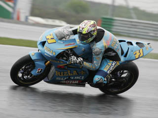 To add to Suzuki's joy, John Hopkins' steady run ensured that both of their riders will start tomorrow on the front two rows, where he will be joined by Randy de Puniet, one of only two riders to remain without points so far this season. LCR Honda's sole rider Casey Stoner suffered two crashes during free practice as the weather hindered his final chance of becoming MotoGP's youngest race winner tomorrow.