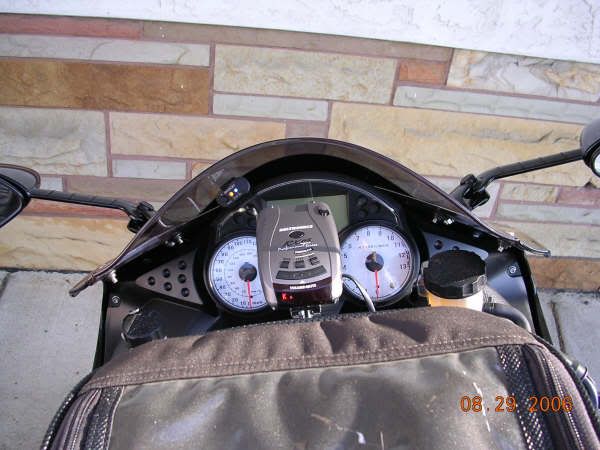 Here's the view with my big ass Joe Rocket tank bag. With the short shaft you can't see half the rx65 because you can't go forward or up. Besides it can't see through the dash.