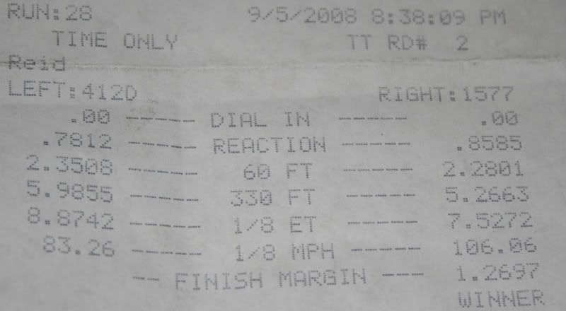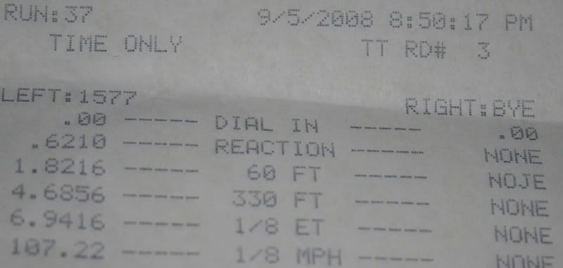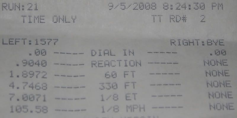 The last 2 times I have been to the dragstrip over the last 4 months, I thought I was stuck going only 7's on my bike in the 1/8th. I figured due to my weight (370lbs) that the bike just wouldn't do any better with me on it. Of course, the 2 second 60 ft times weren't helping any either.
