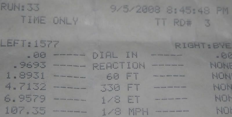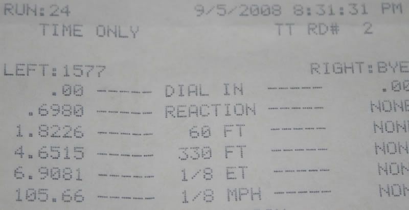 1st track trip: 1.09 rt, 2.06 60ft, 4.98 330ft, 7.29 1/8th, 106.53mph