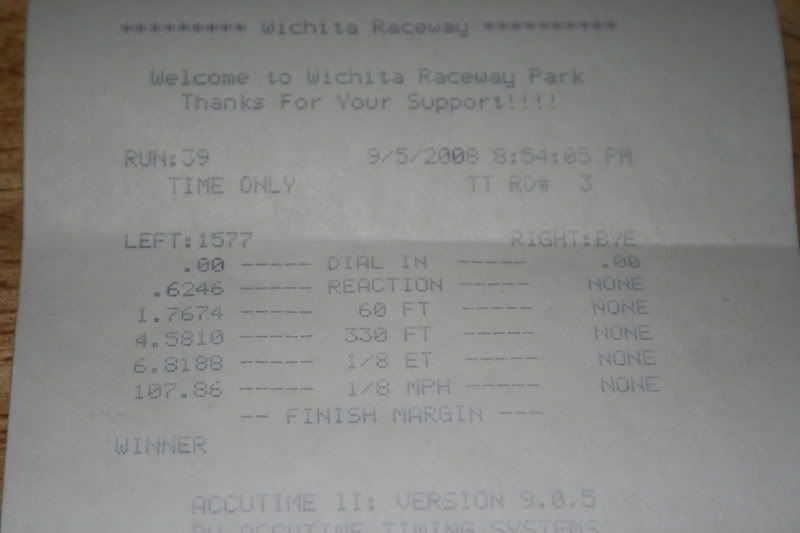 right lane: I pegged the throttle WOT as the 2nd yellow lit and dumped the clutch right after the last yellow lit. The results were alot of tire smoke then a huge wheelie when I tried to feather back the clutch....I had to get out of it to keep from hitting the outside wall. Raced against a small 60-something model falcon that sounded like a top fuel funny car. Don't know what he had, but it looked much fast while it was sitting still......
