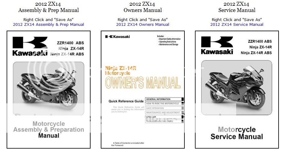 I am trying to download the 3 manuals (2012 ZX14 Assembly & Prep Manual, 2012 ZX14 Owners Manual, 2012 ZX14 Service Manual) and I cant download it from no where.