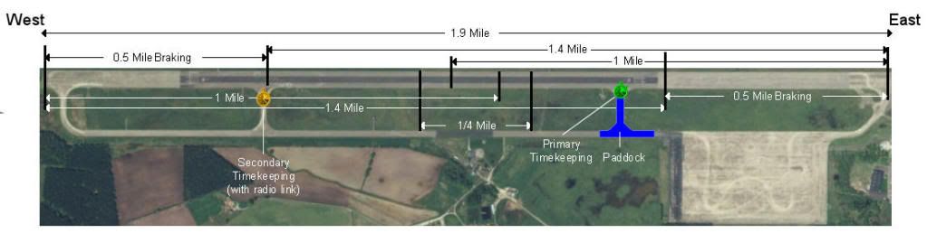From either end it's a standing start mile, then on to 1.4 miles, then a half-mile braking zone. At about three quarters of a mile there's a quarter-mile section with it's own speed traps for flying quarters. The idea is that it's the same either way and a two-way average is calculated to cancel out the effects of head or tail wind.