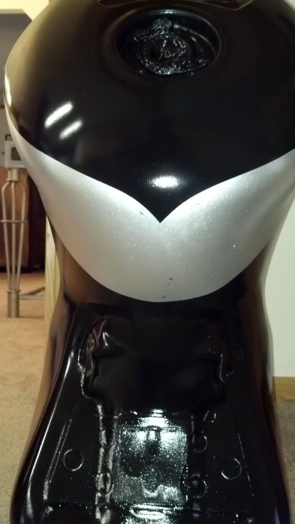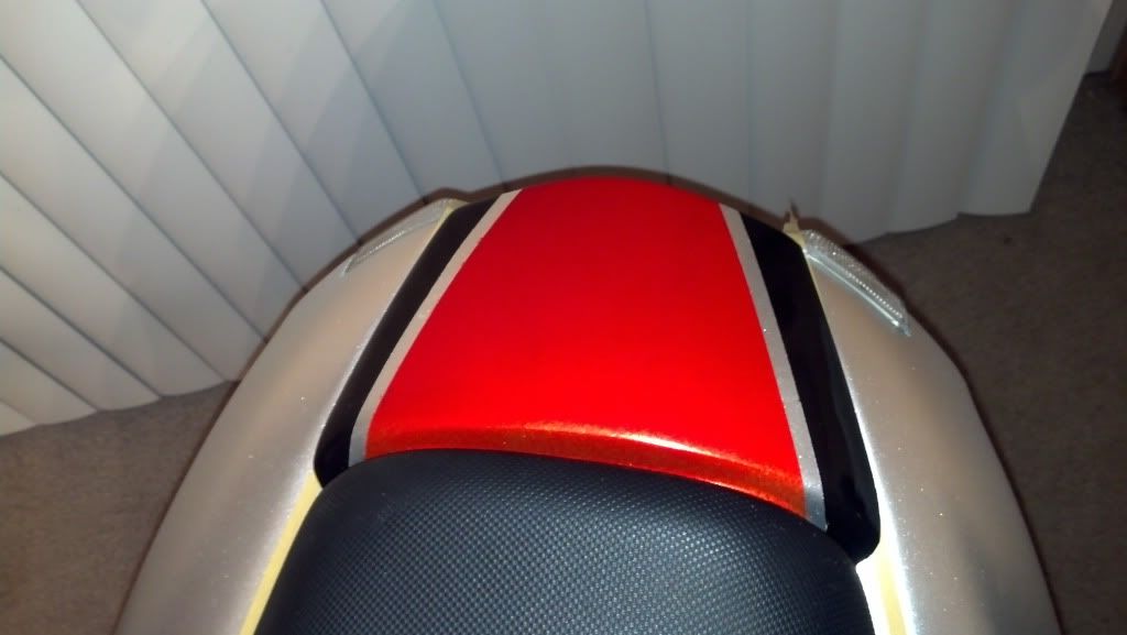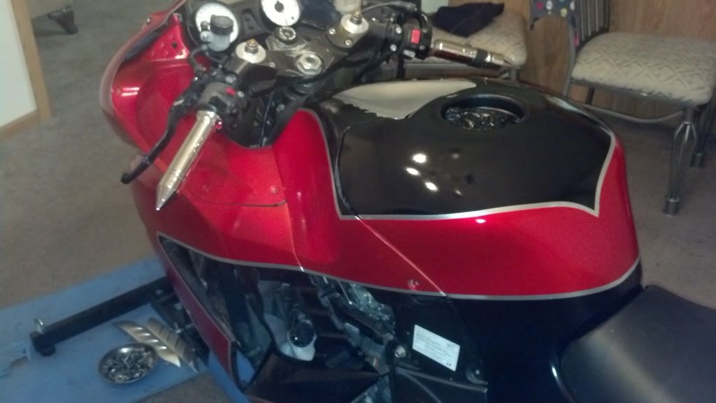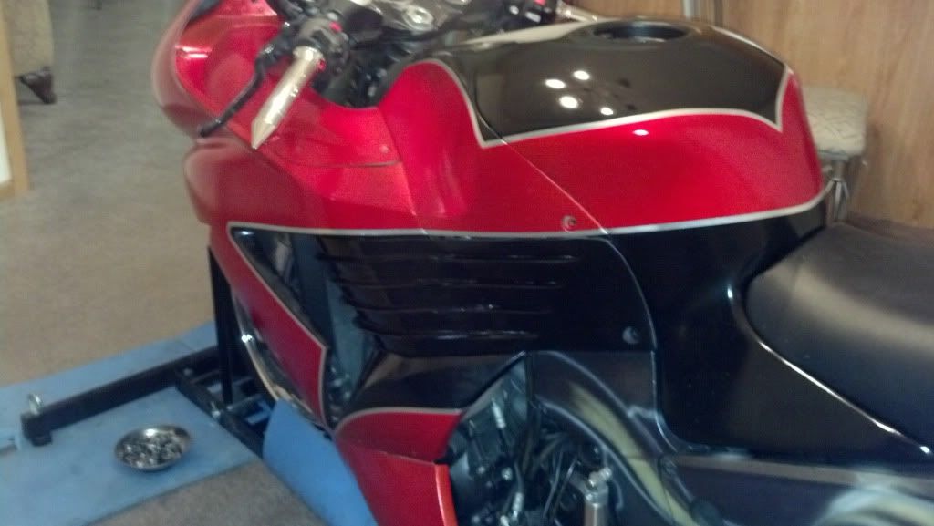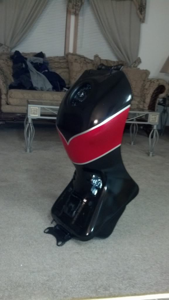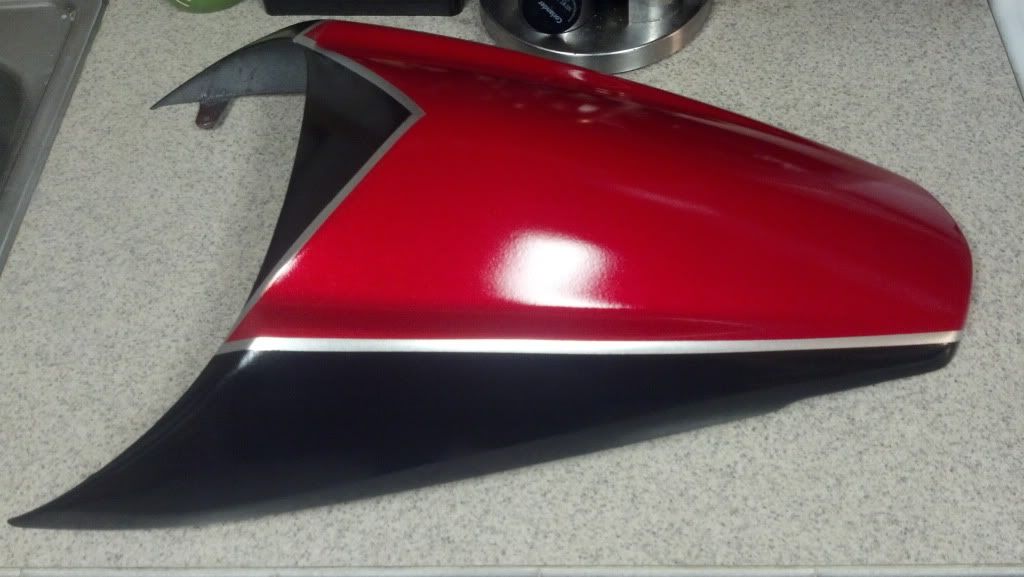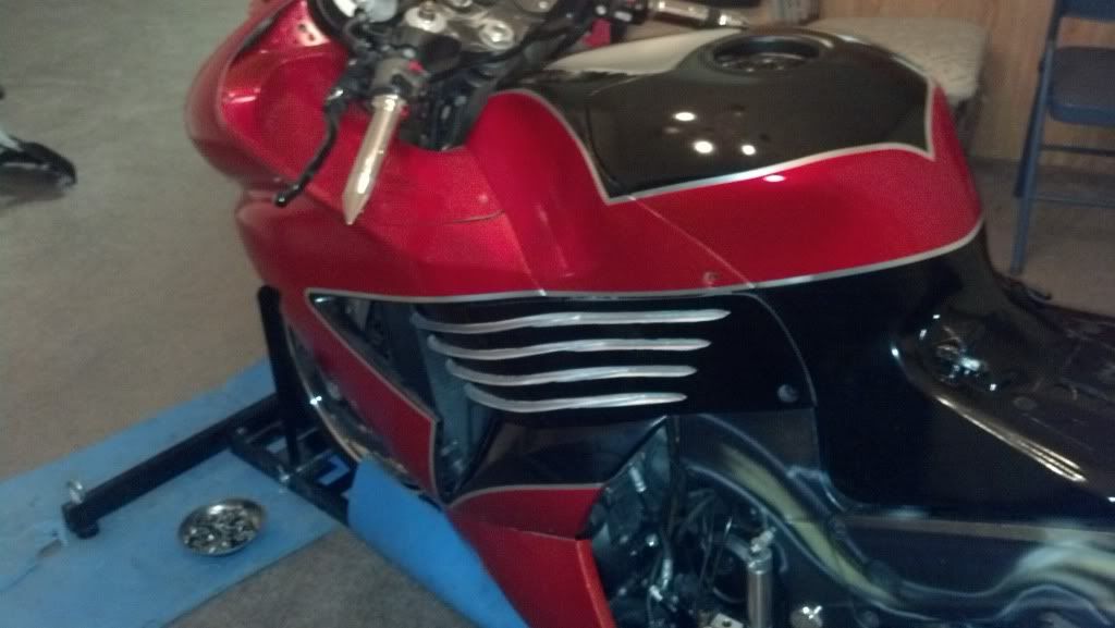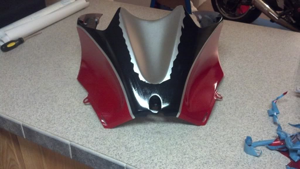 Got to tape off fins, not sure if I want to do them all black or black n red, the 2 rear side panels n the front fender, then the frame has to be done cause the last custom job they painted the actual frame as well. Then I'll wet sand everything n clear the heck out of it, I put 1 coat of clear already so that if it gets a small scratch while handling it I can sand it out, almost there!!
