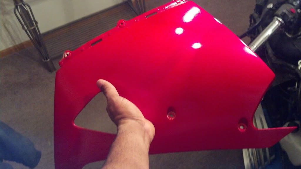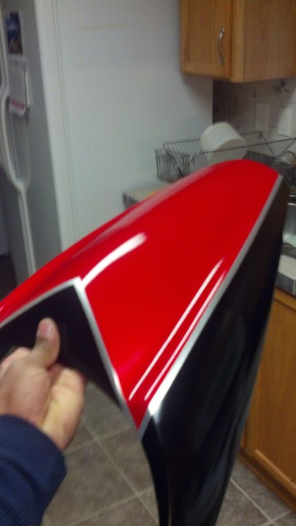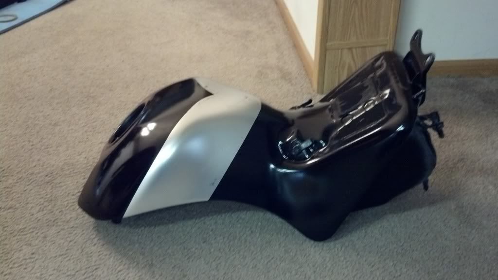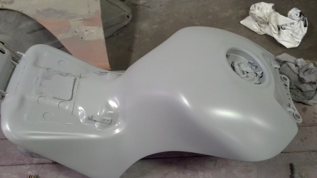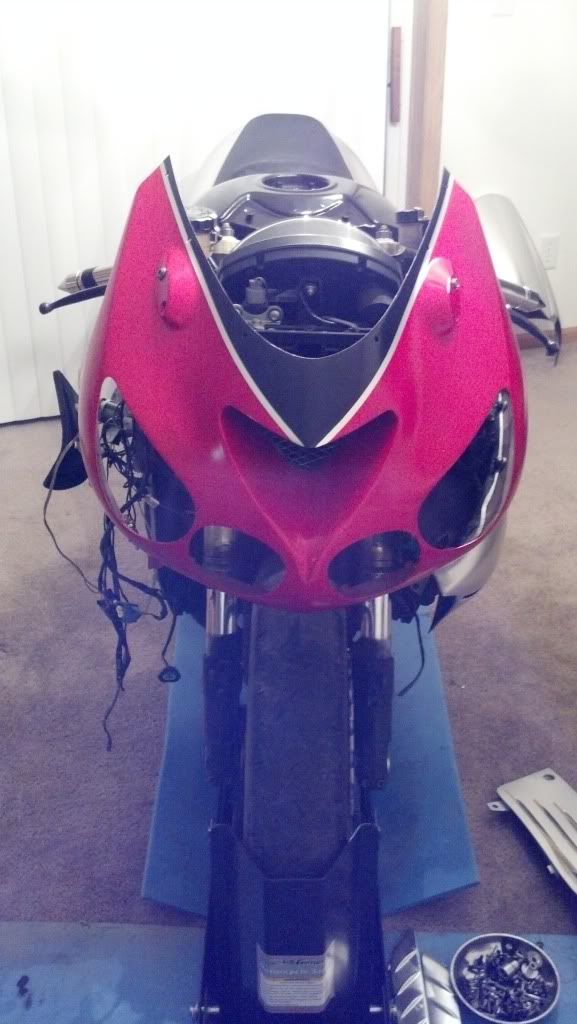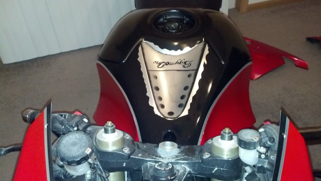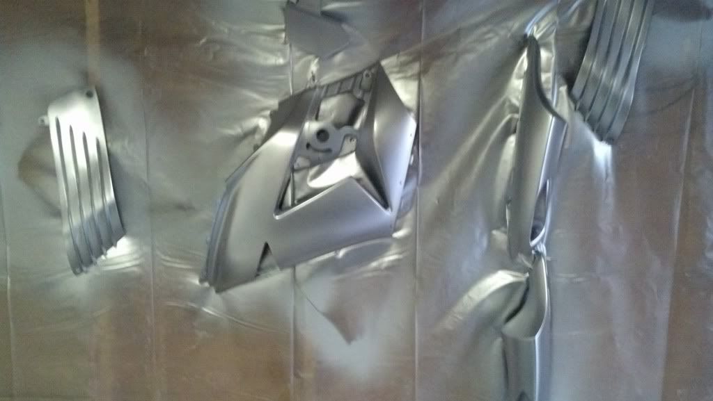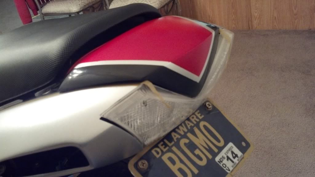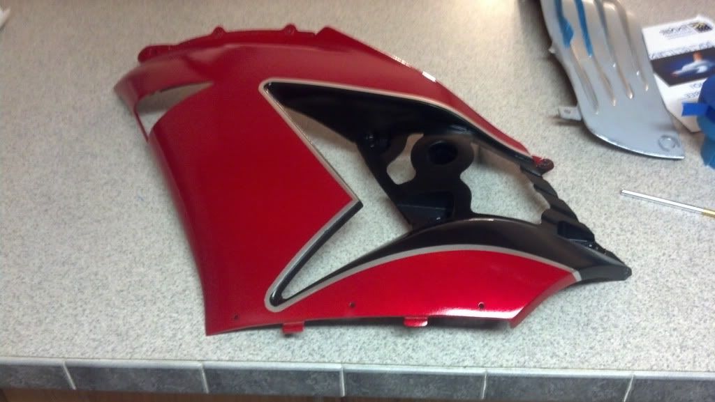 Got to tape off fins, not sure if I want to do them all black or black n red, the 2 rear side panels n the front fender, then the frame has to be done cause the last custom job they painted the actual frame as well. Then I'll wet sand everything n clear the heck out of it, I put 1 coat of clear already so that if it gets a small scratch while handling it I can sand it out, almost there!!