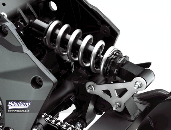 Highly advanced suspension at both ends helped as well. Up front is a 43mm open-class version of the Big Piston Fork (BPF) found on last year’s comparo-dominating Ninja ZX-6R. Featuring a piston design nearly twice the size of a conventional cartridge fork, the BPF offers smoother action, less stiction, lighter overall weight and enhanced damping performance on the compression and rebound circuits. This added compliance results in more control and feedback for the rider – just what you need when carving through a rippled sweeper at your local track or negotiating a decreasing-radius corner on your favorite backroad.