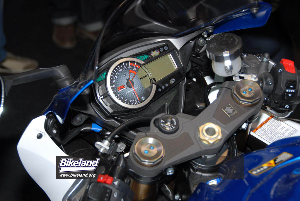 - Instruments include a silver-ringed analog tachometer with LCD speedometer. LCD readouts include odometer, dual trip meters, reserve trip meter, clock, coolant temperature/oil pressure warning indicator, gear position indicator, lap timer/stopwatch, S-DMS setting indicator and bar-graph indicating the instrument lighting level, or brightness.