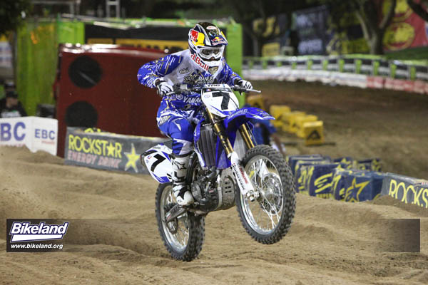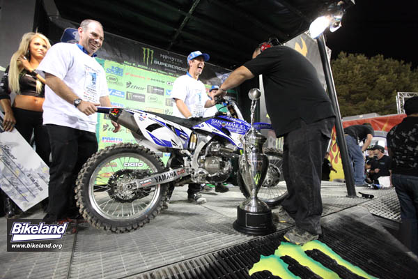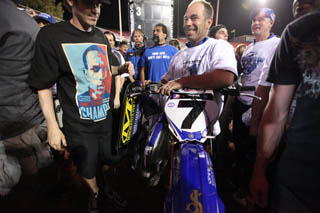 A Stagehand calls for James Stewart's #7 Yamaha YZ450F to be brought up on stage for the podium shot...