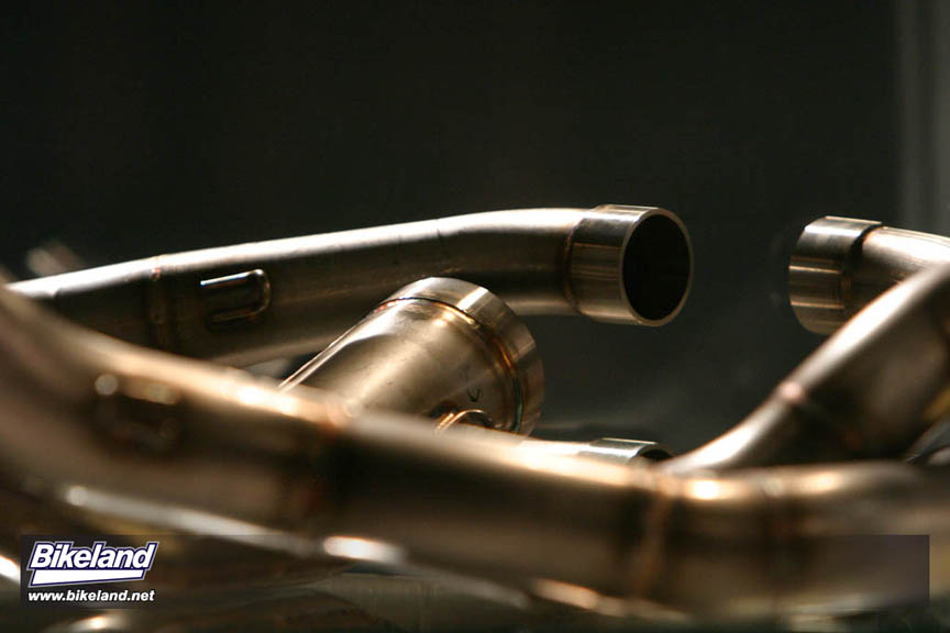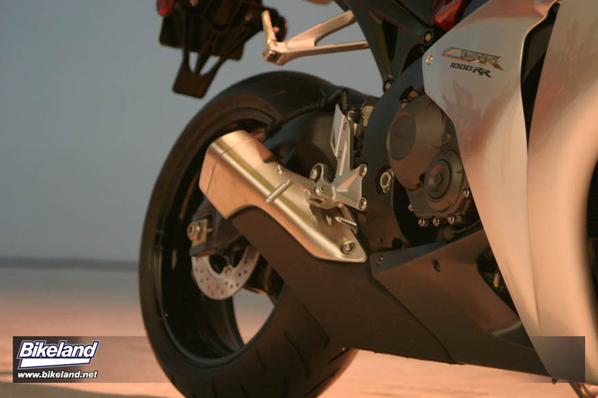The new improved 1000RR sports a shorty GP style exhaust but it's not as short and small as you might think. There's some visual trickery taking place here, and what appears to be black bodywork extending below a small aluminum canister is in fact the canister itself molded, shaped and painted black to look like it's part of the fairing. This allowed Honda engineers the volume the needed to conform to new strict emission standards.